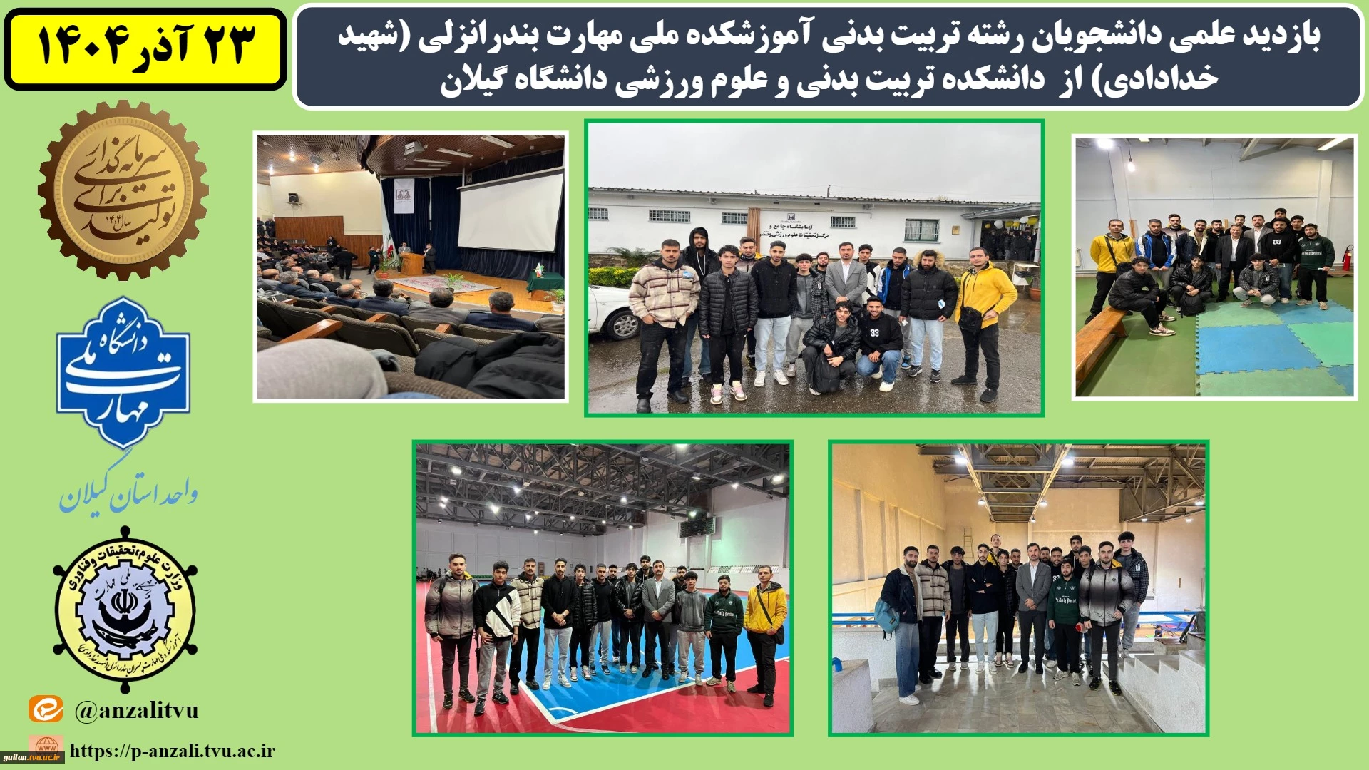 امتیاز دهید : بازدید علمی دانشجویان رشته تربیت بدنی آموزشکده ملی مهارت بندرانزلی (شهید خدادادی) از دانشکده تربیت بدنی و علوم ورزشی دانشگاه گیلان 6 دوشنبه 24 آذر 1404 ساعت 12:58